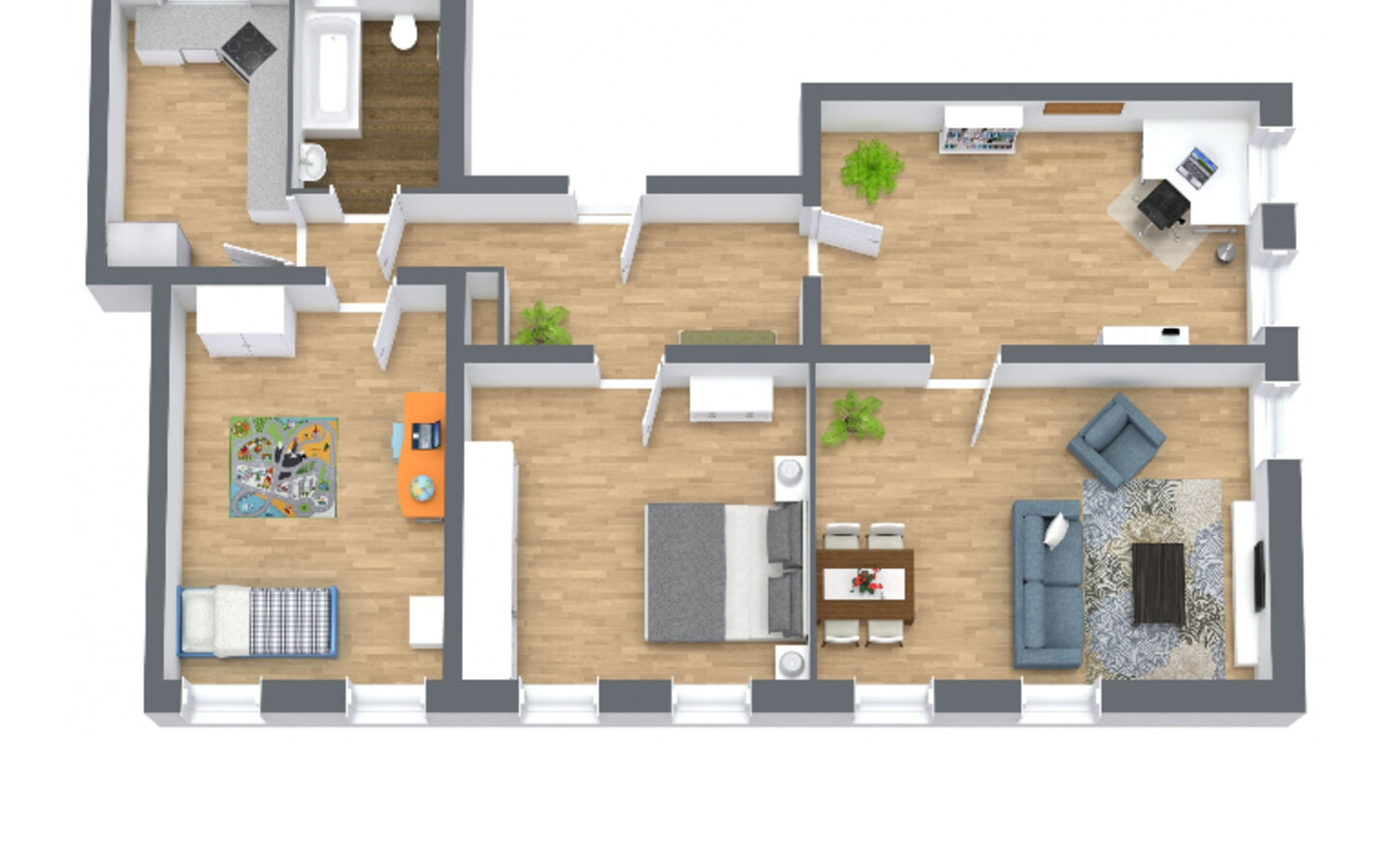 Die gemütliche Wohnung teilt sich auf in einem Wohnzimmer, zwei Kinderzimmer, einem Schlafzimmer, einer Küche und einem Tageslichtbad mit Badewanne.